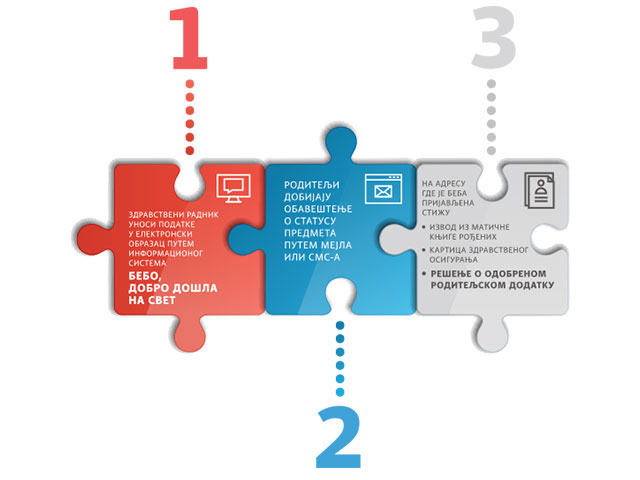 Услуга „Бебо, добро дошла на свет” олакшава родитељима новорођенчета пријаву бебе у матичну књигу рођених, пријаву на пребивалиште, подношење захтева за здравствено осигурање и подношење захтева за родитељски додатак. Цео процес омогућава брзу, једноставну, бесплатну и лаку пријаву већ у породилишту и укидање било какве папирологије, по принципу „све на једном месту“. Коришћењем ове услуге је од априла 2016. године пријављено преко 500.000 беба, а родитељи су се у више од 90% случајева определили да је искористе.