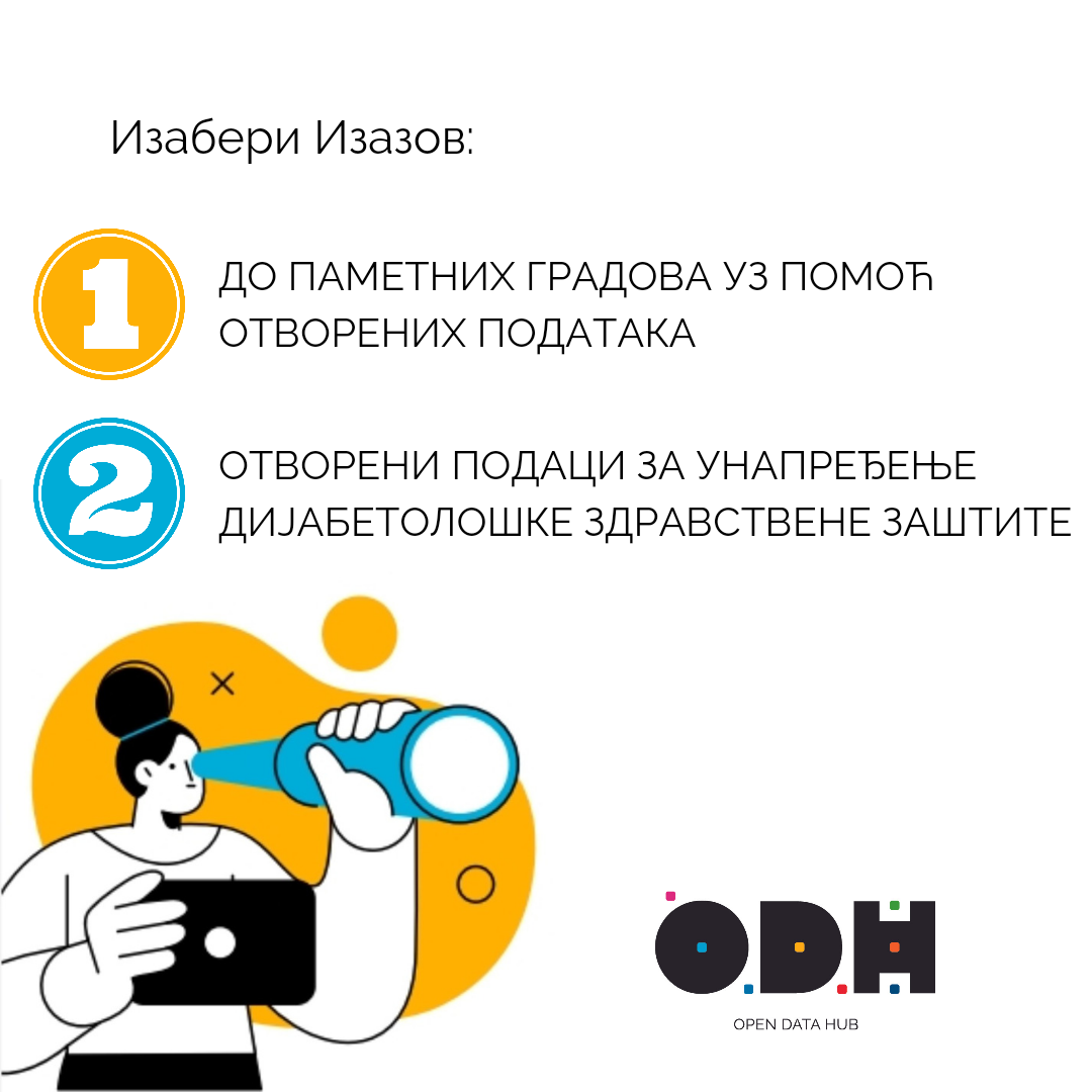 Позивају се сви заинтересовани, а посебно стартапи, удружења, мала и средња предузећа и научно-истраживачке установе, да понуде иновативне одговоре на теме ова два Изазова користећи отворене податке.