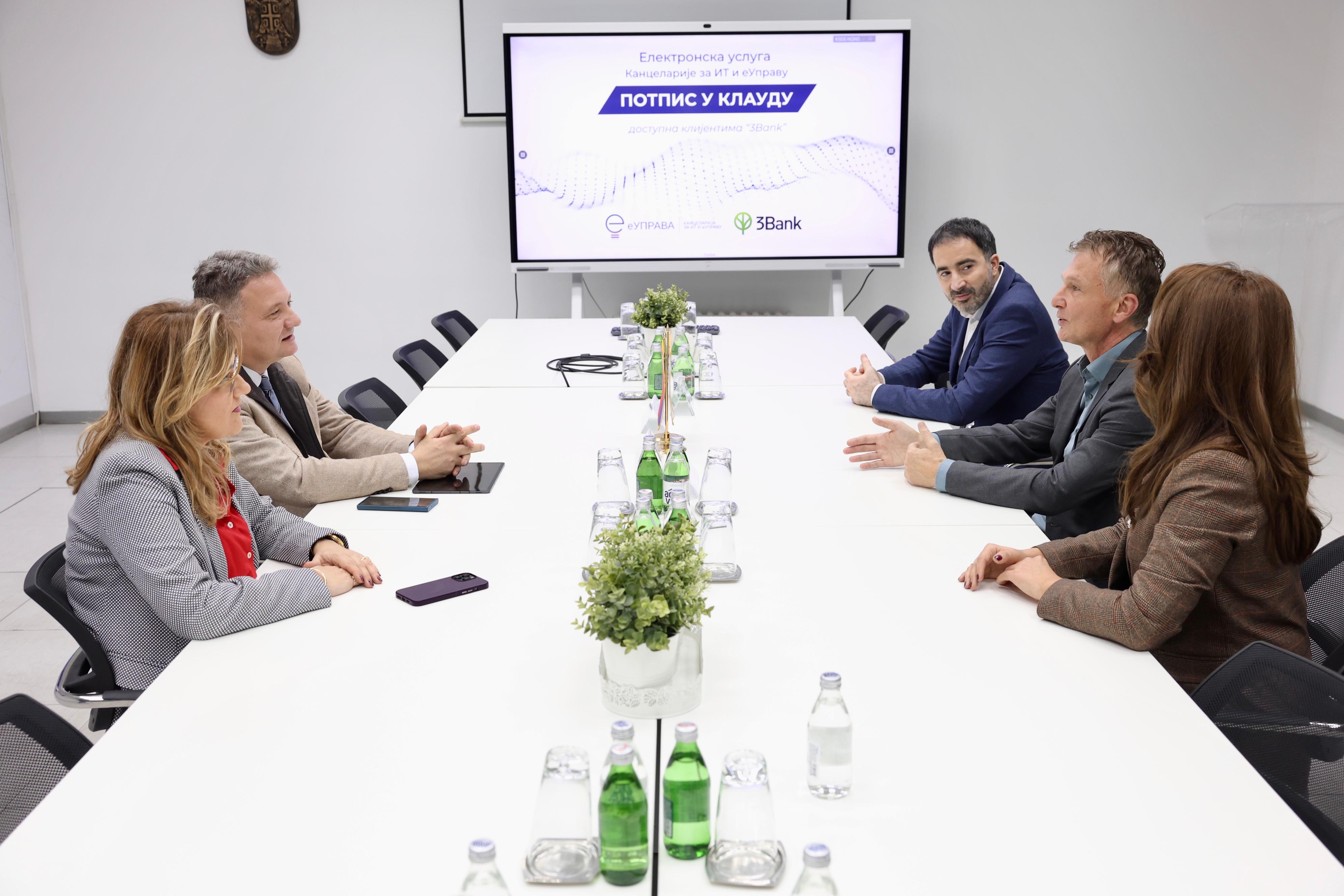 Директор Канцеларије за ИТ и еУправу, др Михaило Јовановић, састао се данас са председником Извршног одбора 3 Банке, Владимиром Вукотићем, поводом успешно реализоване нове електронске услуге за клијенте ове банке, која им на једноставан и безбедан начин, омогућава да потписују своја документа у клауду – Потпис у клауду Канцеларије за ИТ и еУправу.