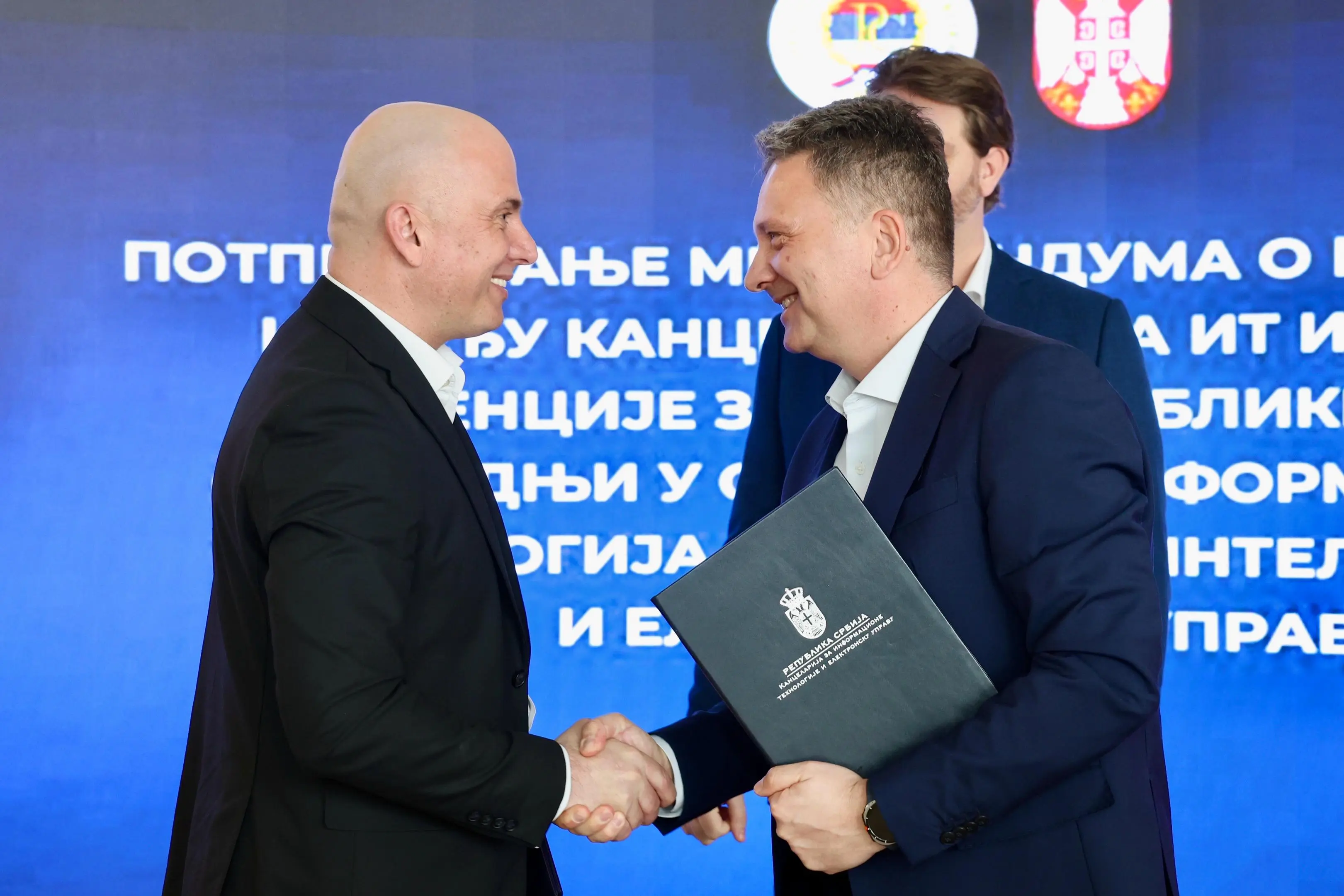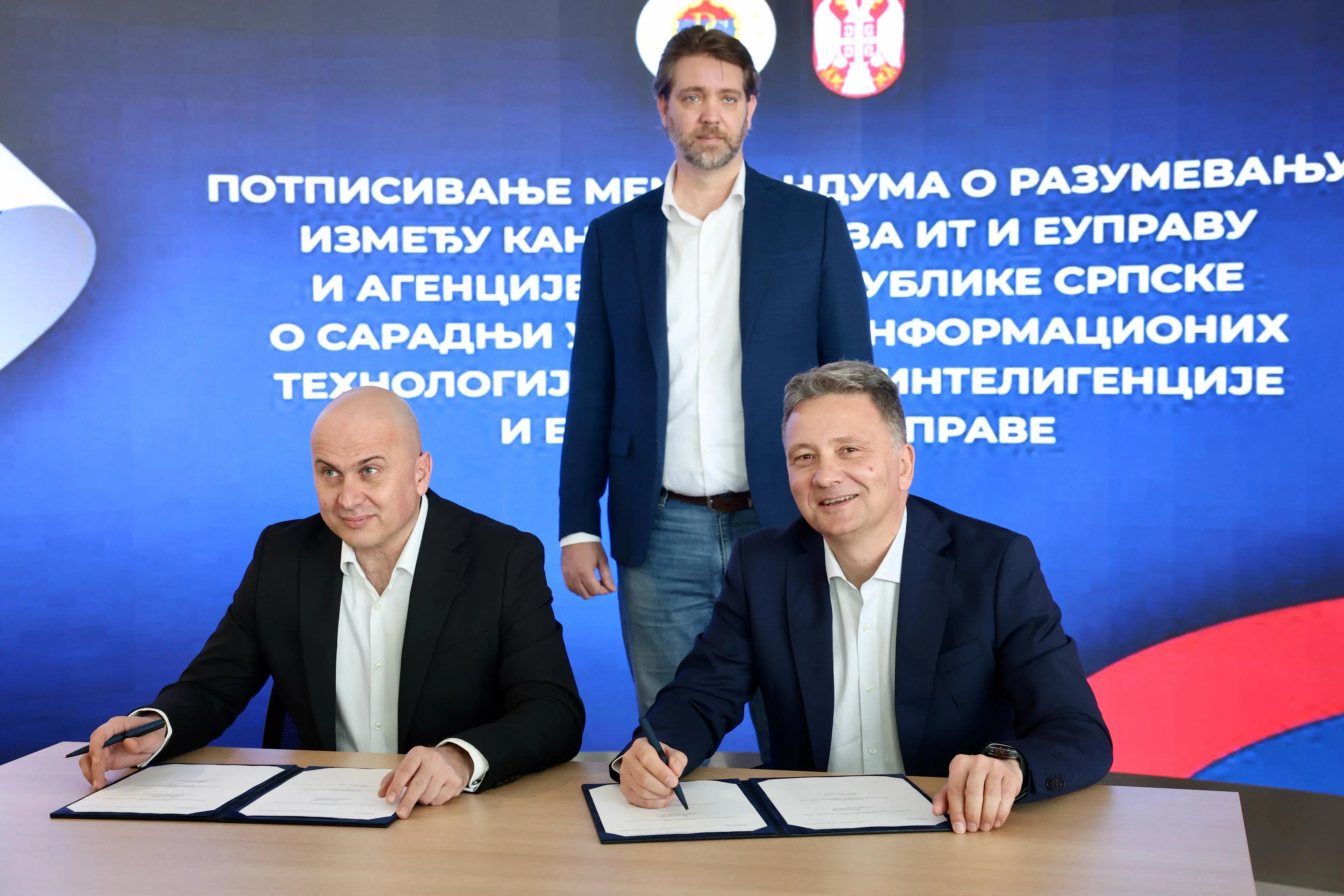 Директор Канцеларије за ИТ и еУправу, др Михаило Јовановић и директор Агенције за информационо-комуникационе технологије Републике Српске, Дражен Вишњић потписали су данас Меморандум о разумевању између Канцеларије за информационе технологије и електронску управу и Агенције за информационо-комуникационе технологије Републике Српске о сарадњи у области информационих технологија, вештачке интелигенције и електронске управе у присуству градоначелника Крагујевца, Николе Дашића.